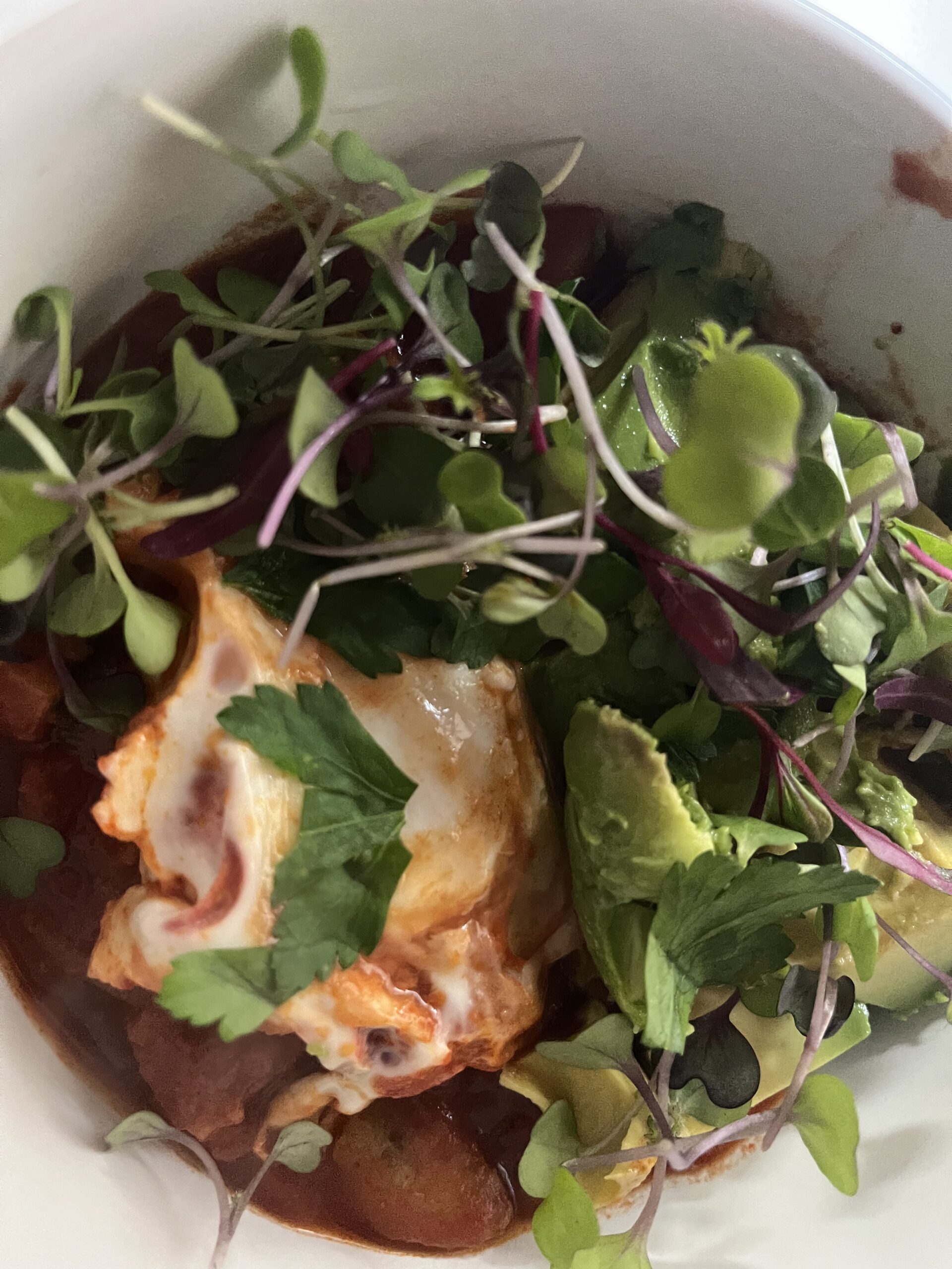 - Cut and soak the potatoes in cold water for at least 30 minutes. This will remove the starch and help them cook when mixed with the other vegetables.Heat the olive oil over medium heat in a saute pan or dutch over. Add the onions, bell pepper, potatoes, salt and ground pepper. Cook until the onion is soft, about 8 minutes.Reduce the heat to low and add the garlic, smoked paprika, cumin and cayenne. Stir and let cook for about 30 seconds, then add the crushed tomatoes and harrisa paste. Simmer for about 15 minutes until the sauce thickens.Add the chopped spinach and stir until wilted, about 3-5 minutes. With the back of a spoon, make wells in the sauce. Crack eggs in each of the wells, cover and cook until the eggs are set – about 5-8 minutes depending on your desired consistency – just keep an eye on them.Once the eggs are at the desired consistency, spoon the Shakshuka into bowls and add salt and pepper and sprinkle with toppings.Toasted bread is great for scooping up yummy Shakshuka goodness!Enjoy!